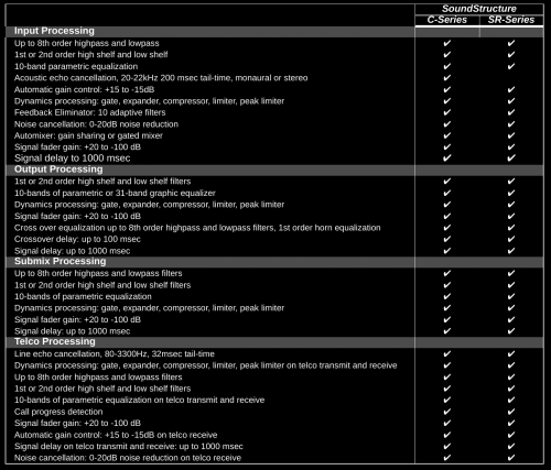 * On each input here, you can see the gain, mute, phantom power, then which tap-point from the signal chain to use. Then EQ and feedback suppression, then echo cancel, noise cancel, gain control, dynamics, automix, delay and fader.