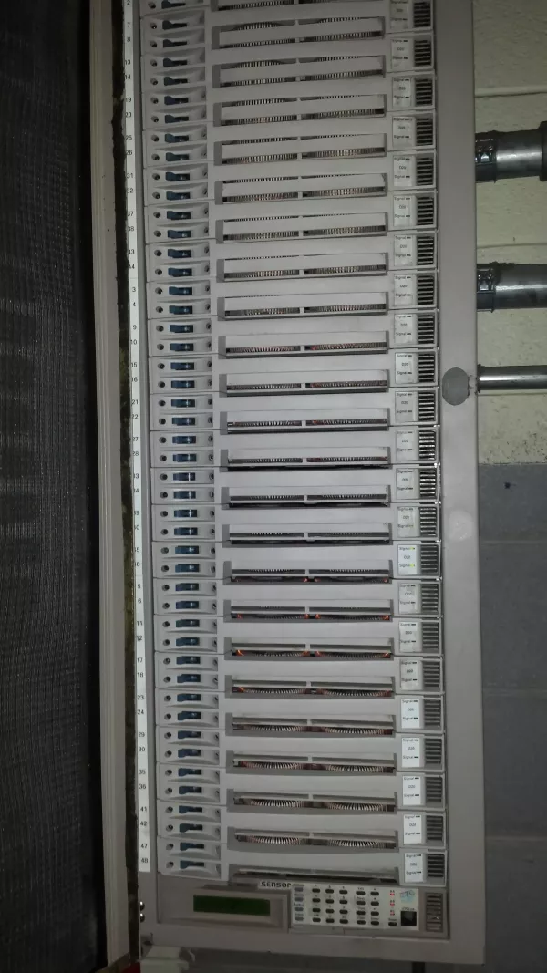 All of the dimmer circuits throughout the school in the Market Square, Cafeteria and Drama room are connected to the central dimmer rack backstage. The dimmer rack is what allows you to very the brightness of each of the circuits by changing the voltage on the circuit. An electronic dimmer rack uses circuits and semiconductors to achieve this task (as opposed to a mechanical or relay based one). The dimmer rack receives 3 phase power (3x 120V) as far as I know, and is split across all of the lighting loads. We've never had an issue with it tripping, and it's rated for over 1 kW per channel (our most powerful lights are 1 kW), if it does, the power is controller from the big disconnect in the electrical room in the back of the office, which staff and student's aren't allowed in.