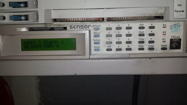 The dimmer rack and all of the lights can be controlled directly from the input section on the bottom. The LCD shows a printout of the command and status. In this photo, the rack and start mean this is rack #1 (on some big stages, you may have multiple dimmer racks), and the 2nd line indicates no lighting board is plugged in.