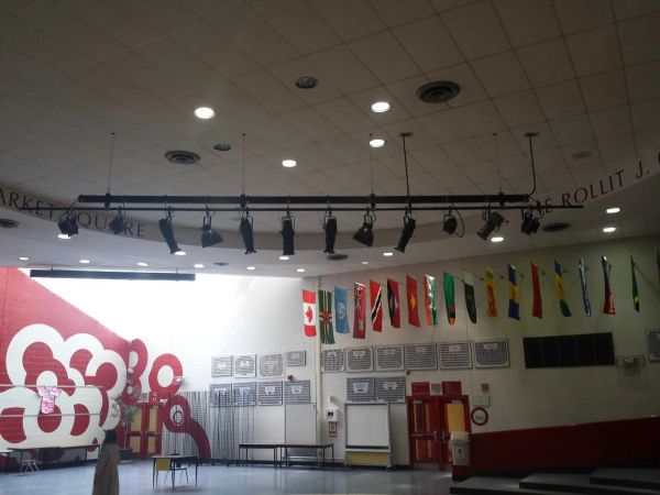 In later years, once the TDSB had electricians with a lift come in and replace the cafeteria lights, we moved the much better quality ETC Source 4 and Lee Colortran ellipsoidals over to the stage. This was since the main shows where spots from a longer distance are needed are for the talent show and school play, both of which take place in the cafeteria. Not to mention, the fact that we only get the chance to change those out once a year or two, so it made sense to move higher quality lights there.